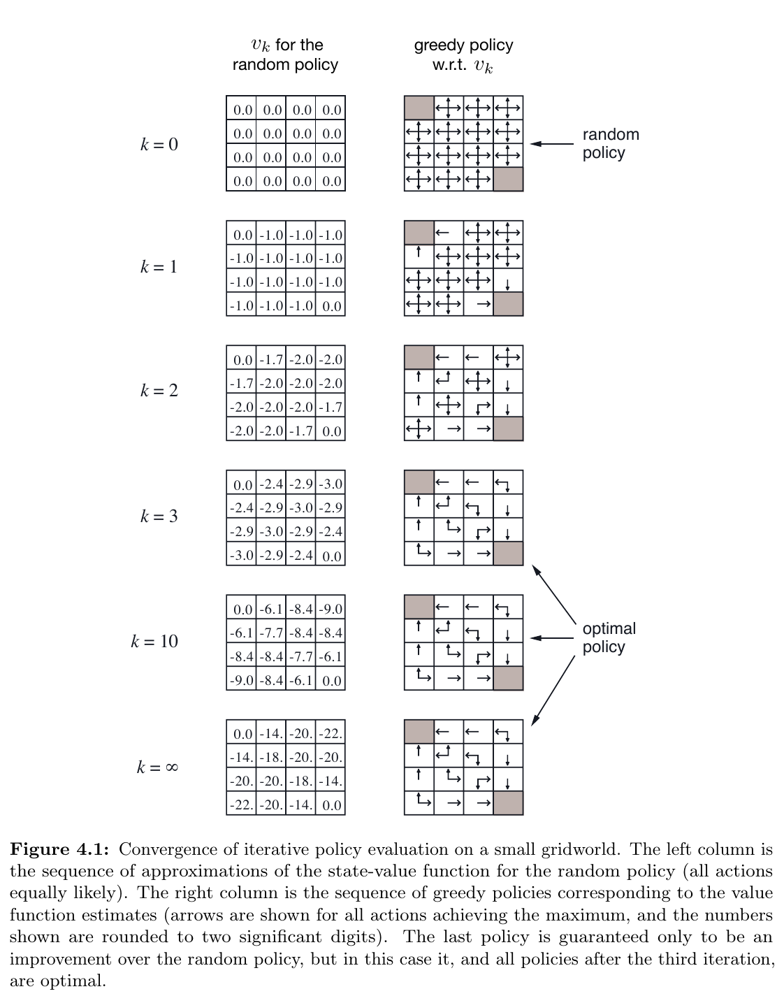 考慮到一個近似價值函數的序列 $v_ 0, v_ 1, v_ 2, \dots,$ 每個映射 $\mathcal{S}^+$ 到 $\mathbb{R}$。 選定任意初始價值 $v_ 0$ (除了中止狀態必須給值為 0),對所有狀態 $s \in \mathcal{S}$,可以利用 Bellman equation (4.4) 進行連續近似: