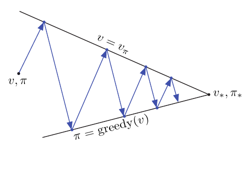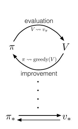 $$ \pi_ {0} \stackrel{\mathrm{E}}{\longrightarrow} v_ {\pi_ {0}} \stackrel{\mathrm{I}}{\longrightarrow} \pi_ {1} \stackrel{\mathrm{E}}{\longrightarrow} v_ {\pi_ {1}} \stackrel{\mathrm{I}}{\longrightarrow} \pi_ {2} \stackrel{\mathrm{E}}{\longrightarrow} \cdots \stackrel{\mathrm{I}}{\longrightarrow} \pi_ {* } \stackrel{\mathrm{E}}{\longrightarrow} v_ {* } $$