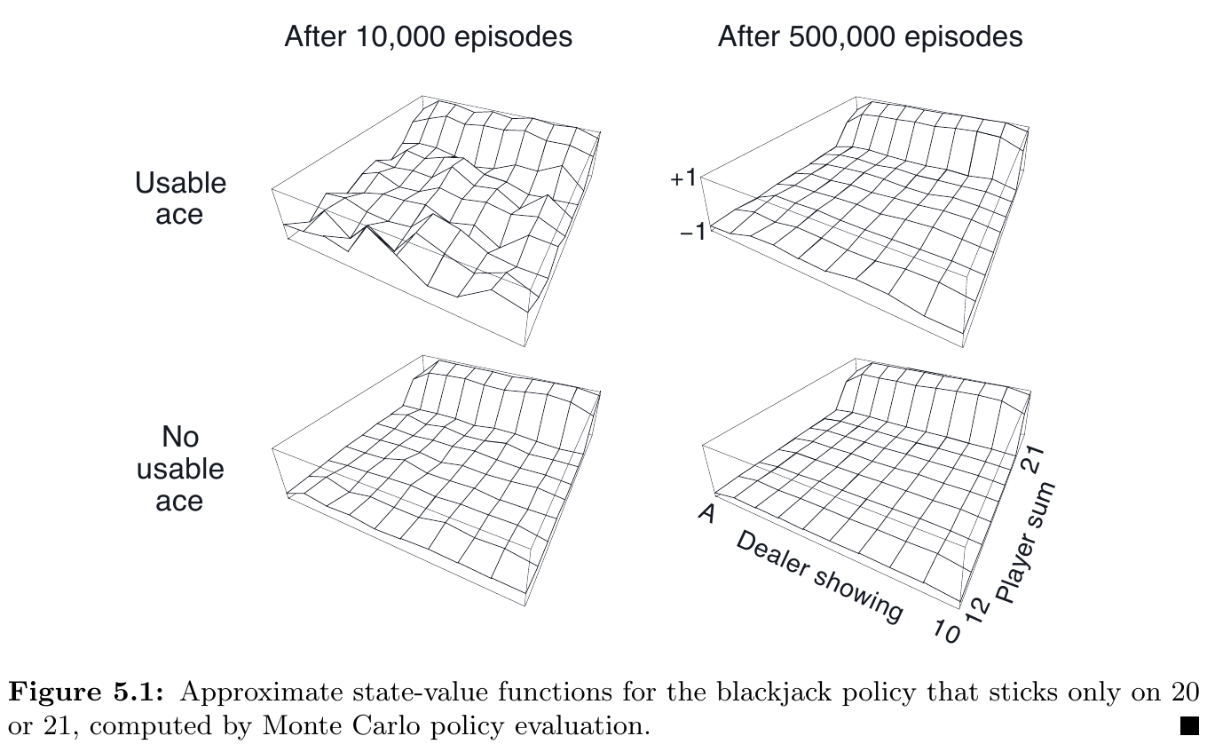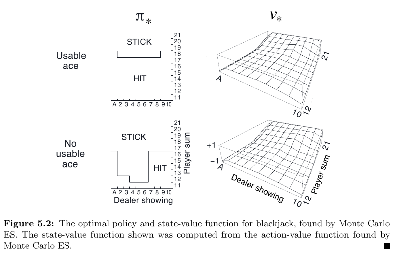 接續 Example 5.1,使用 “20, 21 就停止,其他則跟注” 作為初始的 policy,再以 Monte Carlo ES 找到 optimal policy,結果如下圖: