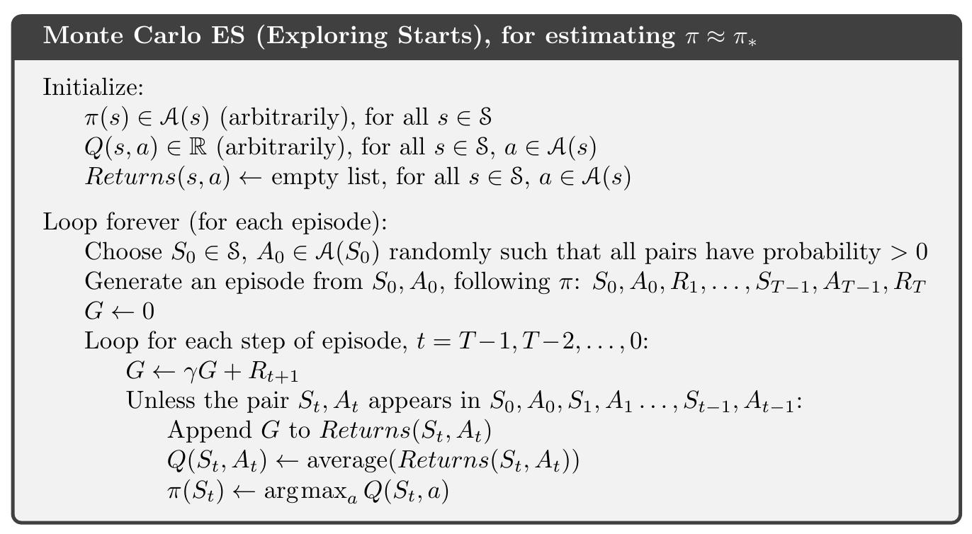 Monte Carlo ES: 對於每個 episode,觀察到的 returns 會拿去算 policy evaluation,然後以該 episode 觀察到所有的 states 進行 policy improvement。完整演算法如下: