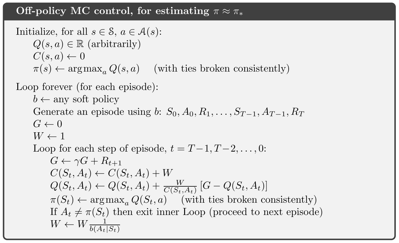 以下是 off-policy MC control 基於 GPI 和 weighted importance sampling,用來估計 $\pi_ *$ 和 $q_ *$。