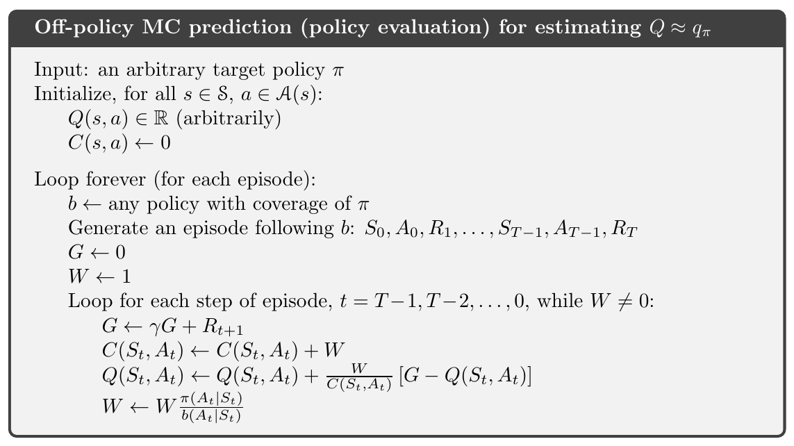 $$ V(s) \doteq \frac{\sum_ {t \in \mathcal{T}(s)} \rho_ {t: T(t)-1} G_ {t}}{\sum_ {t \in \mathcal{T}(s)} \rho_ {t: T(t)-1}} $$