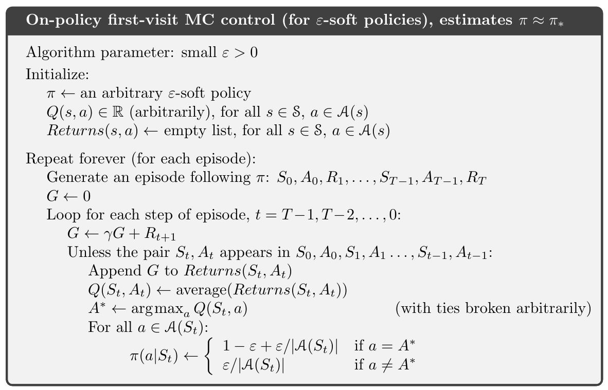 $\varepsilon$–soft: $\pi(a | s) \ge \frac{\varepsilon}{| \mathcal{A}(s) |}$ 對所有 states, action, 還有某個 $\varepsilon > 0$。