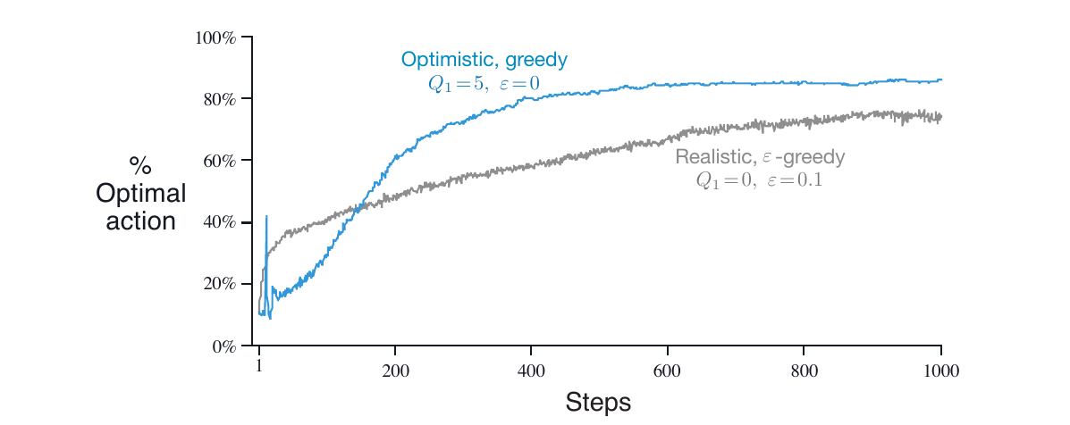 - 這種情況下,初始的估計值都是 $+5$ 是樂觀的 (optimistic),這種樂觀會鼓勵 動作價值法 去探索。
