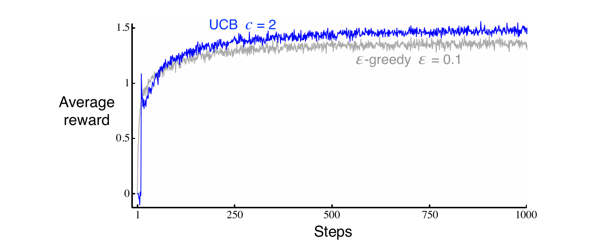 $$A_{t} \doteq \underset{a}{\arg \max }\left[Q_{t}(a)+c \sqrt{\frac{\ln t}{N_{t}(a)}}\right],$$