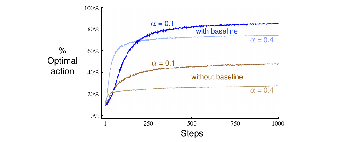 - 如果獎勵比基準大,未來選擇動作 $A_t$ 的機率會增加;否則就降低。