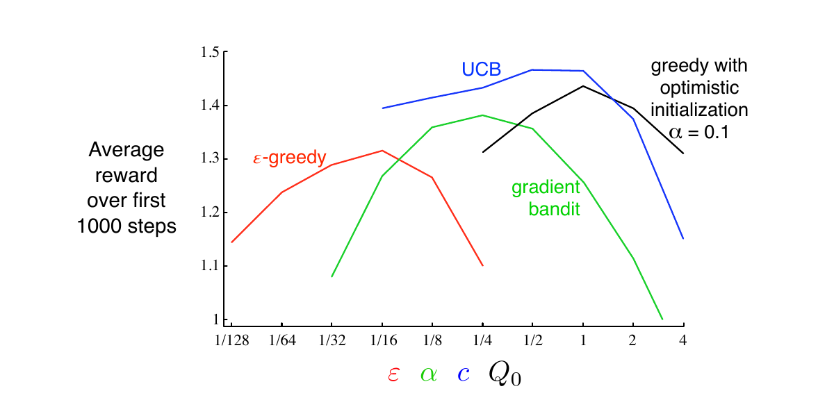 以上的方法都依賴於初始的動作價值 (initial action-value) $Q_1(a)$。在統計學裡,這稱為 偏差 (biased by their initial estimates)。