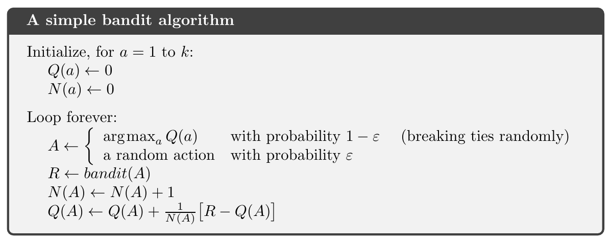 設 $R_{i}$ 為當前動作中第 $i$ 個選擇接收的獎勵值,$Q_n$ 為這個動作第 $n-1$ 次選擇後的估計價值,可以簡寫如下: