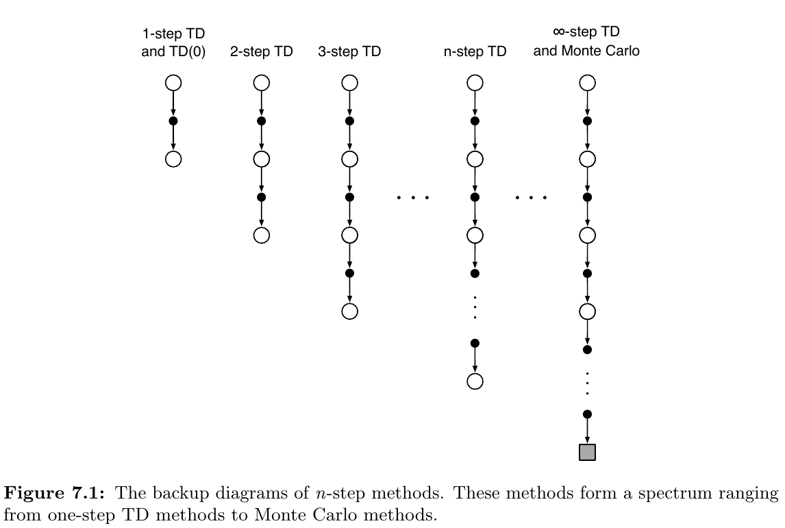 以此類推,n-step TD 更新目標如下: $$ G_{t: t+n} \doteq R_{t+1}+\gamma R_{t+2}+\cdots+\gamma^{n-1} R_{t+n}+\gamma^{n} V_{t+n-1}\left(S_{t+n}\right) $$ 對所有 $n, t$ 使得 $n \ge 1$ 且 $0 \le t \le T-n$。