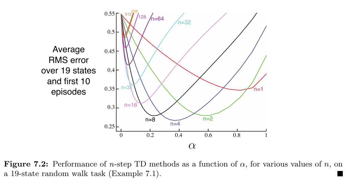 從這個實驗可以知道,n-step 有機會比兩個極端 (1-step TD 與 MC) 結果更好。