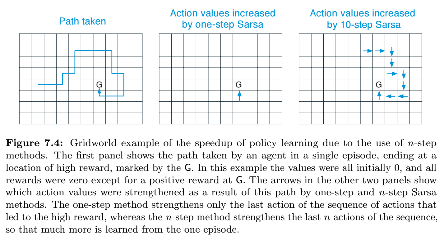 - 從圖上結果可以得知,1-step Sarsa 只會強化最後一個 action,而 n-step Sarsa