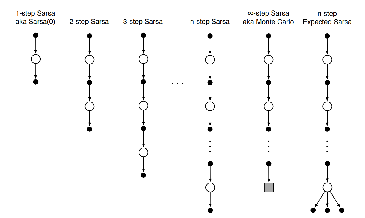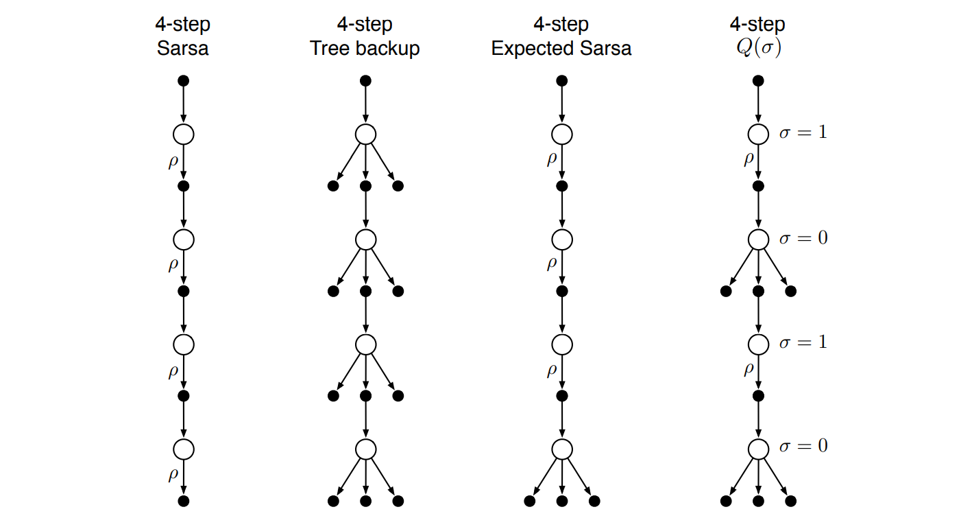 - $n$-step Expected Sarsa: 擁有完全的採樣轉移,除了最後一個 狀態到動作 (state-to-action)
