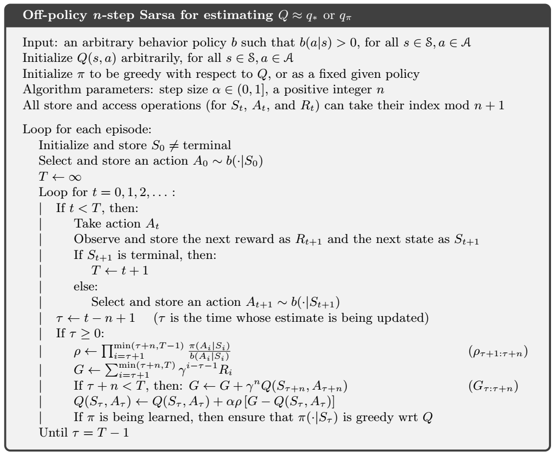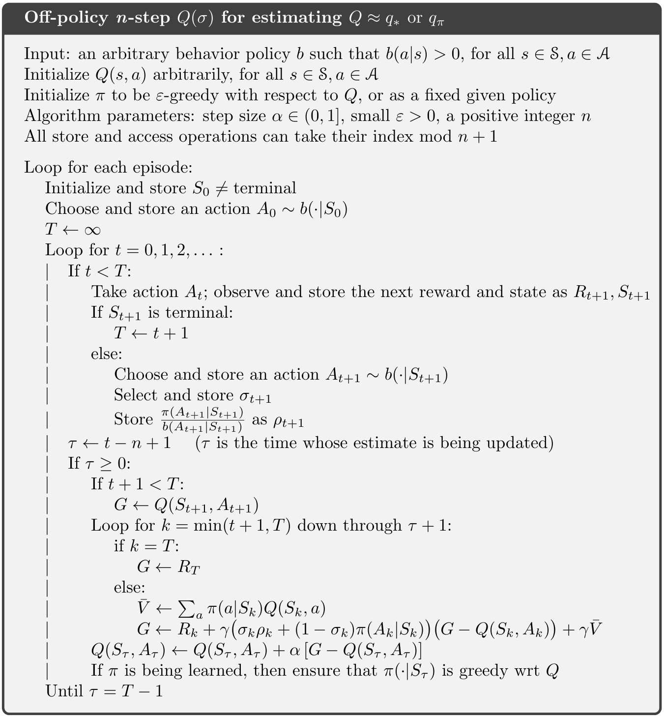 $$ \begin{aligned} G_ {t: h} \doteq R_ {t+1} &+\gamma\left(\sigma_ {t+1} \rho_ {t+1}+\left(1-\sigma_ {t+1}\right) \pi\left(A_ {t+1} \mid S_ {t+1}\right)\right)\left(G_ {t+1: h}-Q_ {h-1}\left(S_ {t+1}, A_ {t+1}\right)\right) \newline &+\gamma \bar{V}_ {h-1}\left(S_ {t+1}\right) \end{aligned} $$
