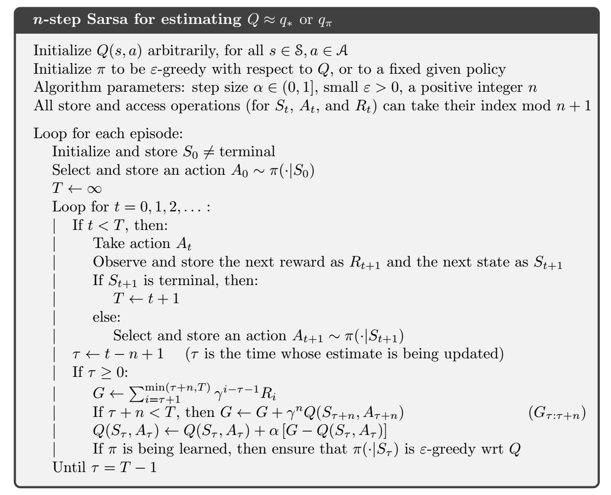 n-step return of Sarsa 可以被寫成一種 TD error 的形式如下: $$ G_{t: t+n}=Q_{t-1}\left(S_{t}, A_{t}\right)+\sum_{k=t}^{\min (t+n, T)-1} \gamma^{k-t}\left[R_{k+1}+\gamma Q_{k}\left(S_{k+1}, A_{k+1}\right)-Q_{k-1}\left(S_{k}, A_{k}\right)\right] $$