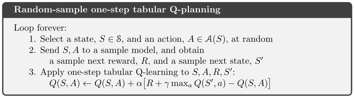 以下展示了一個基於 planning 的 one-step tabular Q-learning 以及隨機從 sample model 採樣的例子,稱為 random-sample one-step tabular Q-planning: