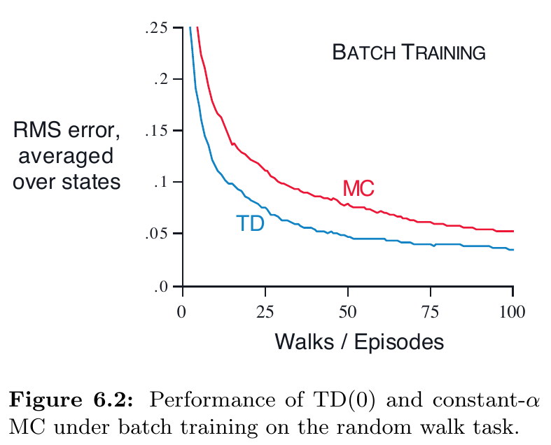 Figure 6.2 展示了利用 batch updating 進行 Example 6.2 的結果。TD 的結果總是比 MC 更好,因為 TD 更相關於預測 returns。