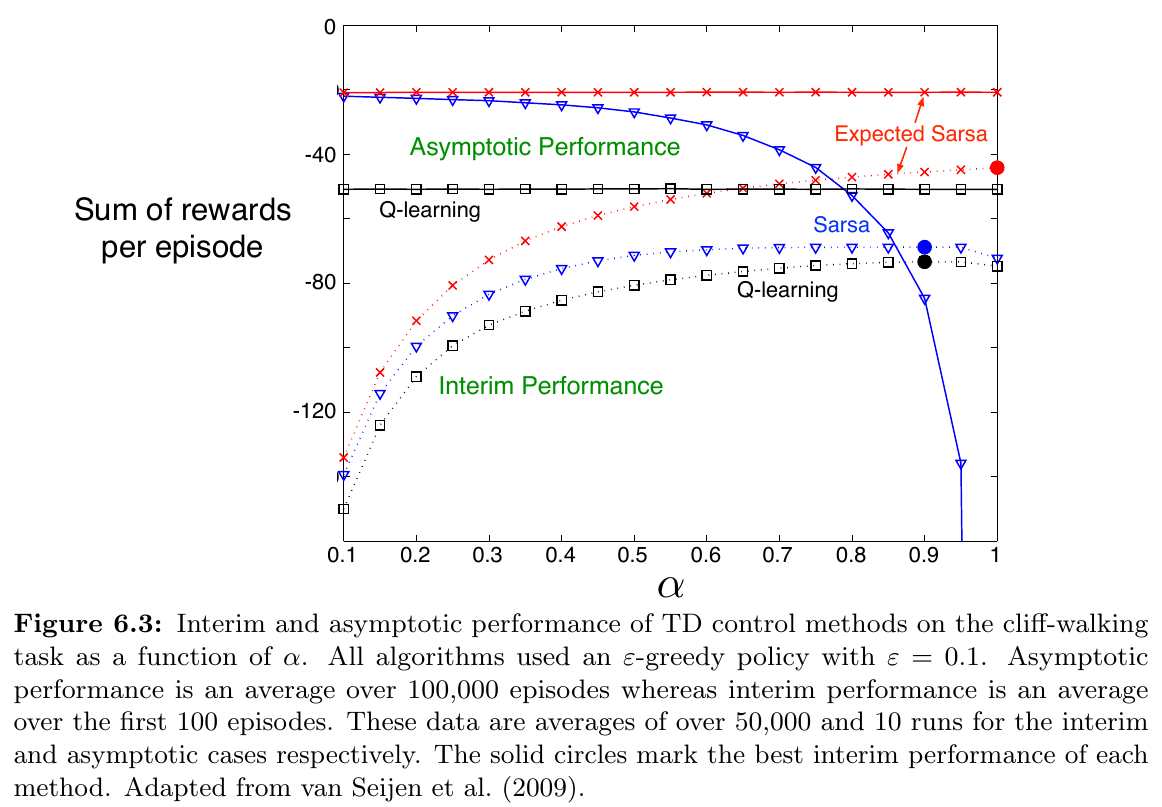 - 因此,Expected Sarsa 可以安全的設定為 $\alpha = 1$ 而不會減少任何效能。