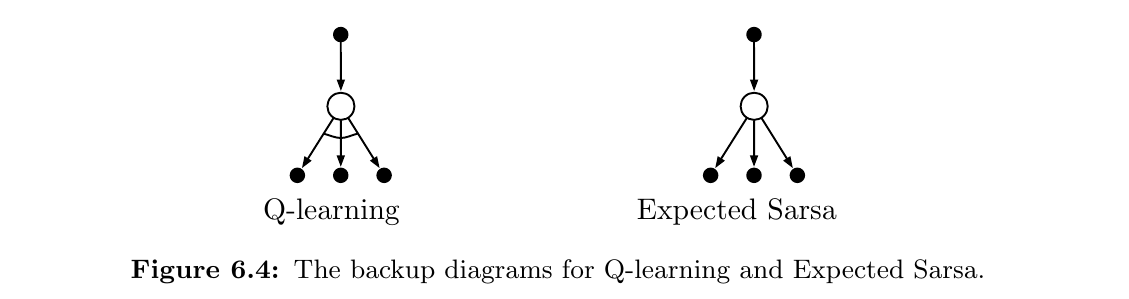$$ \begin{aligned} Q\left(S_ {t}, A_ {t}\right) & \leftarrow Q\left(S_ {t}, A_ {t}\right)+\alpha\left[R_ {t+1}+\gamma \mathbb{E}_ {\pi}\left[Q\left(S_ {t+1}, A_ {t+1}\right) \mid S_ {t+1}\right]-Q\left(S_ {t}, A_ {t}\right)\right] \newline & \leftarrow Q\left(S_ {t}, A_ {t}\right)+\alpha\left[R_ {t+1}+\gamma \sum_ {a} \pi\left(a \mid S_ {t+1}\right) Q\left(S_ {t+1}, a\right)-Q\left(S_ {t}, A_ {t}\right)\right] \end{aligned} $$