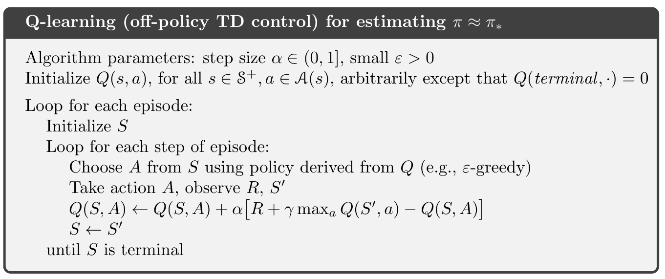 $$ Q\left(S_ {t}, A_ {t}\right) \leftarrow Q\left(S_ {t}, A_ {t}\right)+\alpha\left[R_ {t+1}+\gamma \max _ {a} Q\left(S_ {t+1}, a\right)-Q\left(S_ {t}, A_ {t}\right)\right] $$