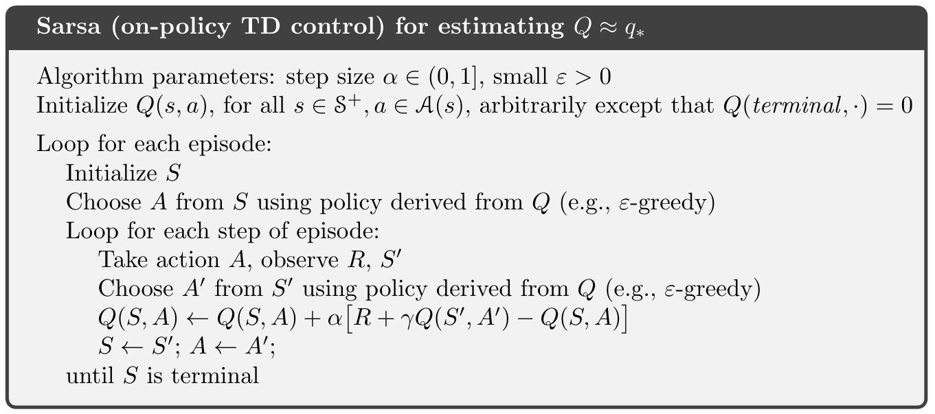 $$ Q\left(S_ {t}, A_ {t}\right) \leftarrow Q\left(S_ {t}, A_ {t}\right)+\alpha\left[R_ {t+1}+\gamma Q\left(S_ {t+1}, A_ {t+1}\right)-Q\left(S_ {t}, A_ {t}\right)\right] $$