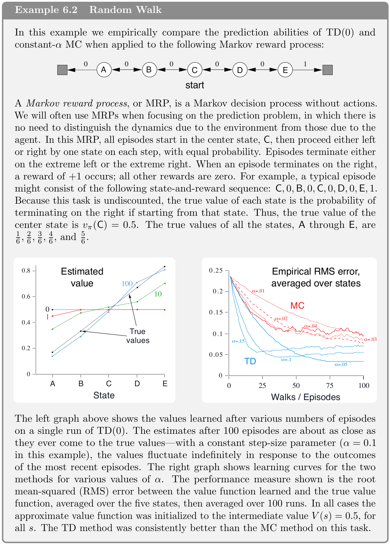 - 實務上,在隨機的任務上 TD 法通常比 constant-$\alpha$ MC 收斂得更快。