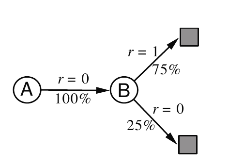 - 根據觀察,$A$ 總是轉移到 $B$,而 $V(B)=\frac{3}{4}$,因此 $V(A)=V(B)=\frac{3}{4}$。可以把它視為一種 Markov process,結果如下圖。這也是 batch TD(0) 計算的結果。