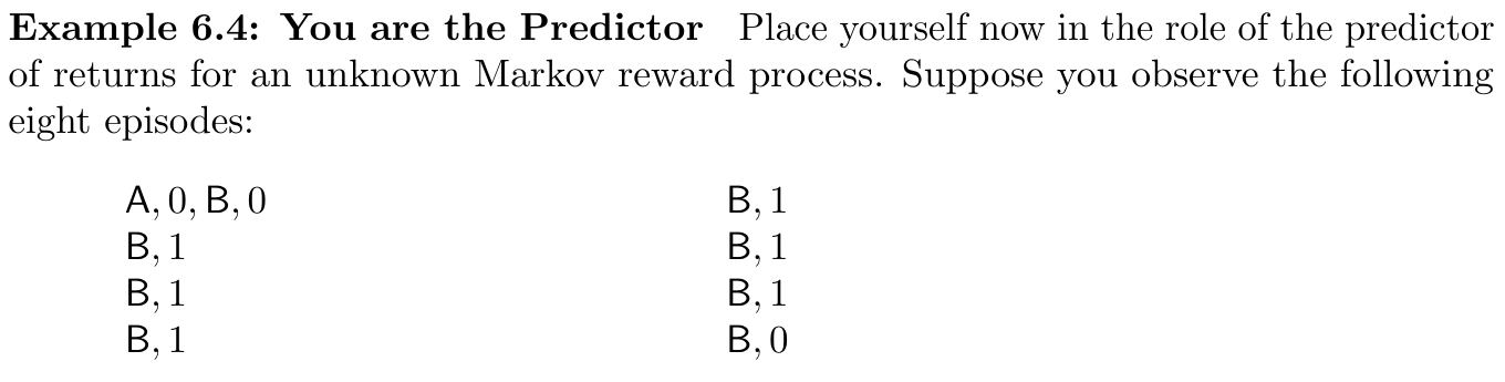 - 另一種方式,則是簡單的認為 $A$ 只看過一次且產生出 reward 為 $0$ 的結果,因此 $V(A)=0$。這是 batch MC 的結果。注意到這也會產生最小的訓練誤差,但我們會期望認為第一個答案會更好。如果這個是 Markov process,將會預期在未來的資料產生更小的誤差,而 MC 則會在已知的訓練資料產生較小的誤差。