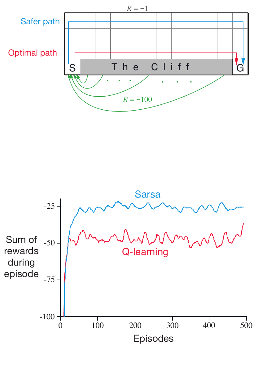 - Q-learning: 學習到 optimal policy,但是 online performance 較差。