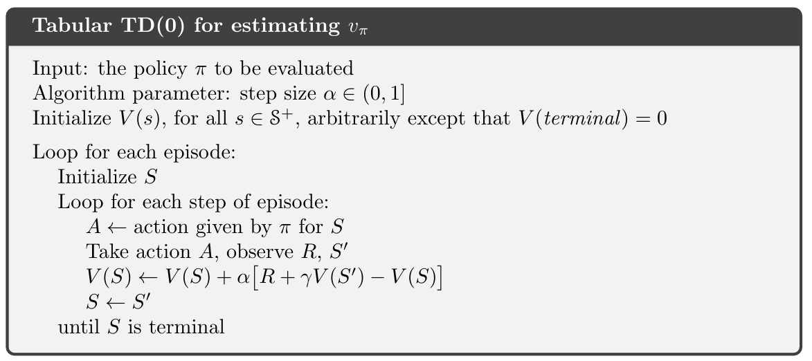 $$ V\left(S_ {t}\right) \leftarrow V\left(S_ {t}\right)+\alpha\left[R_ {t+1}+\gamma V\left(S_ {t+1}\right)-V\left(S_ {t}\right)\right] $$
